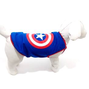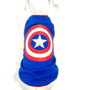 Camiseta confeccionadas em tecido de malha PV azul; Acabamento em cotton vermelha; Silkada na estampa do Capitão América; Tamanho: P; Medidas aproximadas: 31 cm de comprimento, 38 cm de circunferência torax, 23 cm pescoço; Ideal para filhotes ou cachorros/gatos de pequeno porte; Deixando seu Pet na moda com o seu Super heróis favorito. Marca: Não Informado