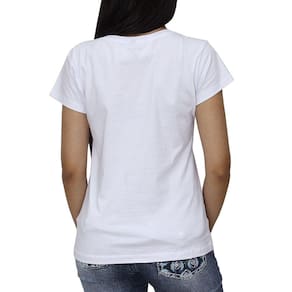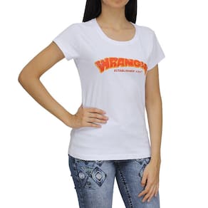 Camiseta feminina Wrangler fabricada em tecido 100% Algodão na cor Branca, possui mangas curtas, gola tradicional e estampa na parte frontal.