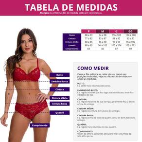 Busto 99 a 103cm / Cintura 88 a 92cm / Cintura Média 91 a 95cm / Quadril 100 a 106cm / Comprimento 87