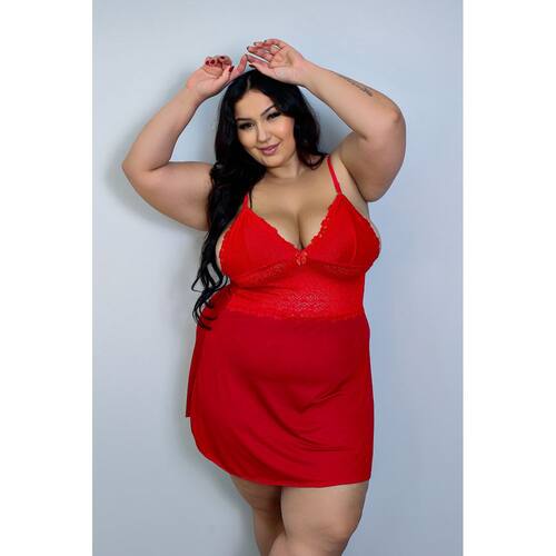 Camisola Plus Size Sensual Sem Bojo Detalhe em Renda Lingerie Feminina Pijama Sexy Linha Noite - VERMELHO - Vermelho - 48