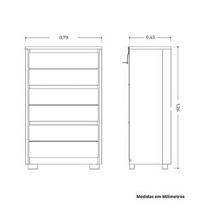 Características: 6 Gavetas Corrediças telescópicas Estrutura em MDP 12 e 15mm Fundo em HDF 3mm Gavetas suportam o peso máximo de 5kg Kit anti-tombamento Tampor suporta peso máximo de 15kg Tampo e molduras de 25mm Possui pés