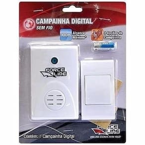 Campainha Digital sem fio Force Line - Alta eficiência, - Baixo consumo da pilha, - 36 opções de campainha, - Design moderno e arrojado, - Muito simples de instalar, - Não requer nenhuma ligação elétrica. Certificada pela Anatel - Nº Homologação: 0973-08-1924. Importante: Não é aconselhável a instalação sobre uma superfície metálica, pois o alcance pode ser prejudicado reduzido consideravelmente ou até mesmo fazer com que ela não funcione. * Quando o som da campainha estiver fraco, aconselhamos a troca das pilhas AA,* Quando a sensibilidade do sensor estiver fraca, aconselhamos a troca da bateria de 12V. Mais Informações - O botão acionador utiliza 1 bateria de 12V modelo 23A inclusa , - O utiliza 2 pilhas de 1,5V tipo AA não inclusa , - Ótimo funcionamento com distância de até 100 metros em área livre , - Para uso em ambiente interno, livre de chuva, umidade e sol, - Frequências RF : 316, 322 e 328MHz.- Frequência: 760Hz e 1000Hz, - Frequência variável alternadamente entre som grave e agudo,Intermitência: 1 a 3 vezes por segundo,Intensidade: >75dB c/ pilhas recarregáveis ,>81dB c/ pilhas comuns ou alcalinas , Autonomia:Pilhas normais - 1 mês 10 acionamentos por dia ,Pilhas alcalinas - 2 meses 10 acionamentos por dia , Acessórios: Parafuso e bucha para fixação na parede não estão inclusos na embalagem.