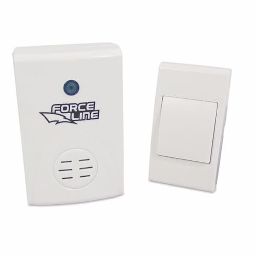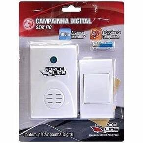 Campainha Digital sem fio Force Line - Alta eficiência, - Baixo consumo da pilha, - 36 opções de campainha, - Design moderno e arrojado, - Muito simples de instalar, - Não requer nenhuma ligação elétrica. Certificada pela Anatel - Nº Homologação: 0973-08-1924. Importante: Não é aconselhável a instalação sobre uma superfície metálica, pois o alcance pode ser prejudicado reduzido consideravelmente ou até mesmo fazer com que ela não funcione. * Quando o som da campainha estiver fraco, aconselhamos a troca das pilhas AA,* Quando a sensibilidade do sensor estiver fraca, aconselhamos a troca da bateria de 12V. Mais Informações - O botão acionador utiliza 1 bateria de 12V modelo 23A inclusa , - O utiliza 2 pilhas de 1,5V tipo AA não inclusa , - Ótimo funcionamento com distância de até 100 metros em área livre , - Para uso em ambiente interno, livre de chuva, umidade e sol, - Frequências RF : 316, 322 e 328MHz.- Frequência: 760Hz e 1000Hz, - Frequência variável alternadamente entre som grave e agudo,Intermitência: 1 a 3 vezes por segundo,Intensidade: >75dB c/ pilhas recarregáveis ,>81dB c/ pilhas comuns ou alcalinas , Autonomia:Pilhas normais - 1 mês 10 acionamentos por dia ,Pilhas alcalinas - 2 meses 10 acionamentos por dia , Acessórios: Parafuso e bucha para fixação na parede não estão inclusos na embalagem.