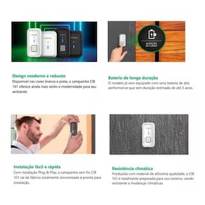 DESCRIÇÃO DO PRODUTOA Campainha Intelbras Cib 101 é um dispositivo projetado para alertar a presença de visitantes em uma residência ou escritório. Ela é fácil de instalar e é alimentada por uma bateria de 9V, dispensando a necessidade de fios elétricos.A Campainha Intelbras Cib 101 emite um som de campainha claro e nítido quando alguém pressiona o botão externo, que é resistente à chuva e outras condições climáticas adversas. Ela possui um alcance de até 100 metros, o que significa que o receptor interno pode ser colocado em qualquer lugar da residência ou escritório sem comprometer o sinal.O receptor interno da Campainha Intelbras Cib 101 possui três opções de som diferentes, permitindo que os usuários escolham o som que preferem. Ele também possui um LED indicador que acende quando a campainha é acionada, tornando mais fácil para os usuários perceberem quando há visitantes chegando.A Campainha Intelbras Cib 101 é fácil de configurar e não requer conhecimento técnico especializado. Ela é uma excelente opção para quem busca uma campainha confiável e fácil de usar em sua residência ou escritório.Em resumo, a Campainha Intelbras Cib 101 é um dispositivo de alta qualidade que oferece uma campainha clara e nítida para alertar a presença de visitantes em uma residência ou escritório. Fácil de instalar, com um botão externo resistente à chuva, alcance de até 100 metros e receptor interno com três opções de som diferentes, a Campainha Intelbras Cib 101 é uma excelente opção para quem busca praticidade e comodidade.ESPECIFICAÇÕES- Design moderno e robusto, disponível nas cores branca e preta.- Equipado com uma bateria de alta performance com duração estimada de até 5 anos.- Tecnologia sem fio, com instalação Plug & Play.- Preparada para uso externo, sendo resistente a mudanças climáticas.- Alcance de até 100 metros sem barreiras.- Sincronização de até 10 módulos externos e inúmeros módulos internos.- 5 níveis de volume e 5 melodias.- LEDs Indicativos.- Produto sai de fábrica sincronizado, pronto para instalação.INFORMAÇÕESMarca: IntelbrasModelo do Produto: Cib 101Cor: BrancoFrequência de Operação: 433.92 MHzVoltagem: BivoltDuração da bateria/pilha: Até 5 AnosTipo de baterias ou pilhas: Batería 3 V 220mAh CR2032 (instalada no produto)Comprimento do botão externo: 2,4 cmLargura do botão externo: 4,4 cmAltura do botão externo: 8,4 cmComprimento do receptor interno: 2,7 cmLargura do receptor interno: 6,2 cmAltura do receptor interno: 8,8 cmPeso: 0,100 kgCONTEÚDO DA EMBALAGEM1 módulo externo1 módulo interno1 bateria CR20321 kit de parafuso para fixação1 kit fita dupla face para fixação1 manual do usuário.GARANTIA1 Ano de garantia de fábrica
