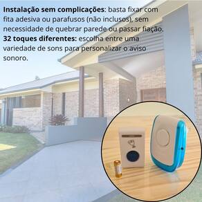 Principais Vantagens: Instalação sem complicações: basta fixar com fita adesiva ou parafusos (não inclusos), sem necessidade de quebrar parede ou passar fiação. 32 toques diferentes: escolha entre uma variedade de sons para personalizar o aviso sonoro. Alcance sem fio em área livre Botão resistente à água, ideal para áreas externas. Alta durabilidade, baixo consumo de energia. Design compacto, discreto e elegante.