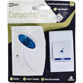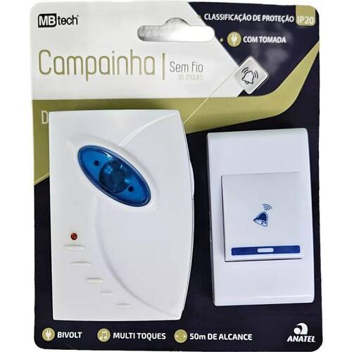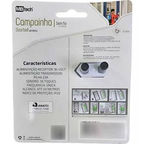 Campainha Sem Fio Wireless Casa Apartamento Escritório MBTEC Campainha Sem Fio - Doorbell Wireless Transforme a experiência de receber visitas com a nossa Campainha Sem Fio Com 36 toques diferentes, você pode personalizar o som da sua campainha conforme o seu gosto. Características: Transmissor: Escolha o melhor local para fixação, remova a tampa com uma chave pequena e coloque as baterias respeitando as polaridades. Pode ser fixado com parafuso ou fita dupla-face inclusa . : Plugue em uma tomada visível para garantir a melhor qualidade de som. Pode ser fixado em uma peça móvel para deslocamento conforme necessário. Seleção de Sons: 36 opções de toques para personalizar o som da sua campainha. Utilize a chave seletora na base do para escolher. Especificações: Alimentação : Bi-volt Alimentação Transmissor: Pilha 23A Sonoro: 36 toques Frequência: Única Alcance: Até 50 metros Índice de Proteção: IP20 Homologação: ANATEL, Produto Homologado 17499-22-12086 Garanta já a sua Campainha Sem Fio e leve praticidade e estilo para a sua casa Nota: Produto homologado pela ANATEL, garantindo qualidade e segurança. Marca: Não Informado