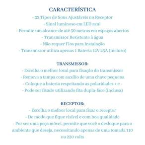 facilidade e praticidade basta fixar o transmissor com o fixador de dupla face incluso , onde quiser, na fachada da sua casa, qualquer cômodo, escritório ou comércio, plugar a campainha em uma tomada e pronto você terá apenas que, colocar a bateria já inclusa , no transmissor e escolher entre os 32 toques melodias , que mais lhe agradar instalação fácil e rápida ela possui um raio de alcance de 30 metros em campo aberto flexibilidade de uso total pode ser utilizada como campainha para idosos e pessoas com limitações motoras, basta deixar o transmissor ao alcance destas pessoas, e o campainha , você pluga em qualquer cômodo que tenha uma tomada de 110/220 volts. Muito mais segurança para a sua família e o melhor custo benefício para você bonita, prática, e de rápida instalação