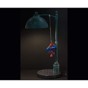 - Design legal: Medindo 40,6 cm de altura, esta luminária de mesa com tema de fandom apresenta um design de iluminação pública com uma base de paralelepípedos. Uma figura esculpida do Homem-Aranha fica pendurada de cabeça para baixo em sua pose exclusiva, adicionando o toque final perfeito.