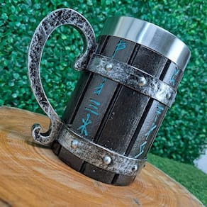 Apresentamos a Caneca Viking Runas, uma peça imponente feita de resina, com capacidade de 600ml e um copo interno de aço inoxidável. Seu design detalhado em relevo proporciona um acabamento artesanal magnífico.