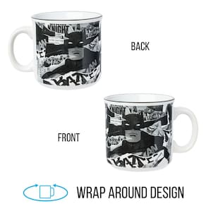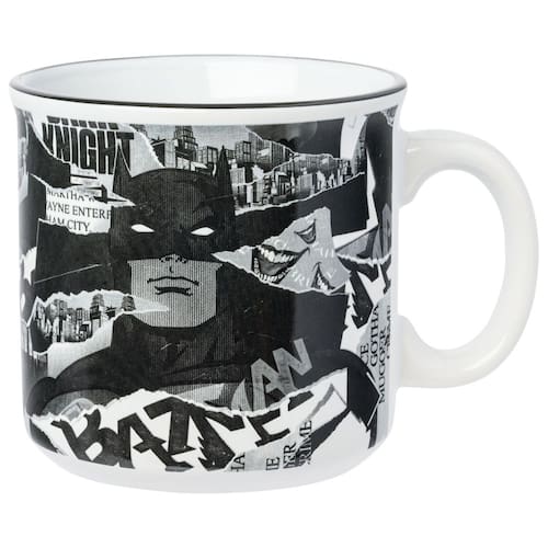 - Design ousado Batman: abrace o Cavaleiro das Trevas com esta caneca de cerâmica campista de 590 ml com uma colagem dinâmica de imagens rasgadas de quadrinhos do Batman. O design superdimensionado é perfeito para o seu café da manhã ou combustível noturno para combater o crime.