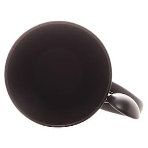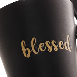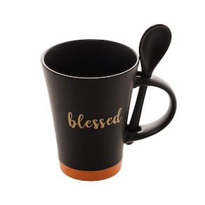 Caneca Wolff preto fosco com base cor de laranja e estampa "blessed" acompanhada de colher.