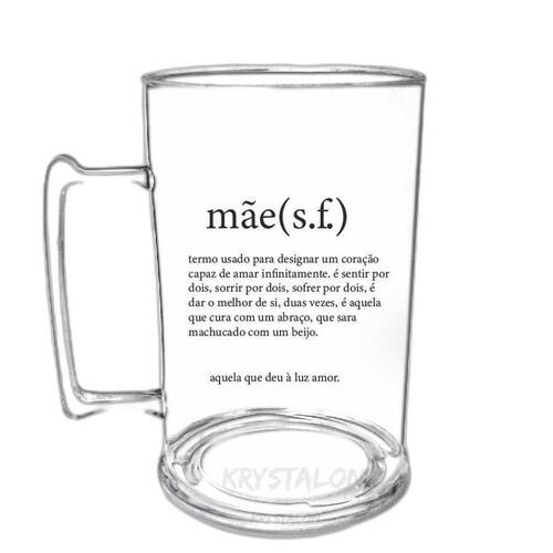 Caneca Chopp Personalizada Para Dia Das Mães - Signficado A Caneca de Chopp 450ml de Poliestireno Liso da KrystalON é ideal para presentear a sua mãe nessa data tão especial Vem personalizada especialmente para aquela pessoa tão querida pra gente tomar suas bebidas preferidas. Aproveite a nossa Caneca de Chopp e surpreenda sua mãe com os produtos personalizados da KrystalON. Especificações: Material: Acrílico Poliestireno Liso Altura: 12 cm Diâmetro: 7,3 cm Capacidade: 450 ml Cor: Transparente Quantidade: 1 peça Marca: Não Informado