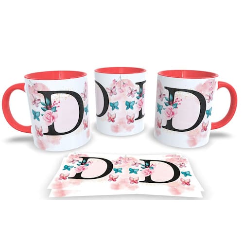 Caneca de porcelana de alto brilho, com alça e interior Vermelha Coleção Alfabeto Iniciais Nomes.
