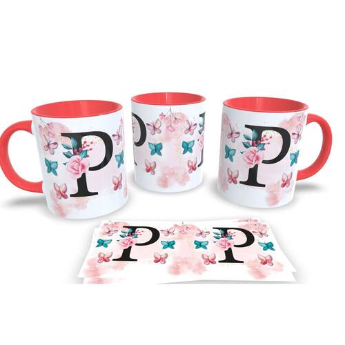 Caneca de porcelana de alto brilho, com alça e interior Vermelha Coleção Alfabeto Iniciais Nomes.