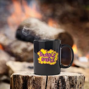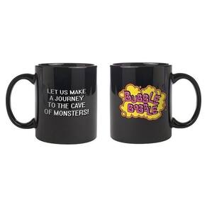 - Caneca preta mostra o logotipo da Bubble Bobble.