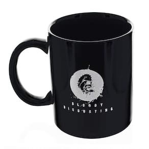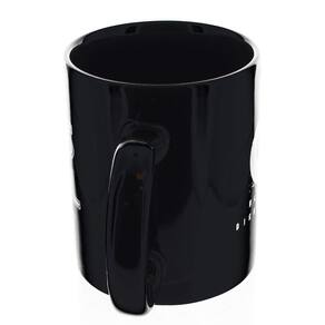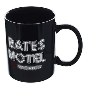 - A caneca de café preta apresenta o nome do infame motel seguido por uma placa sem vacancia acesa.
