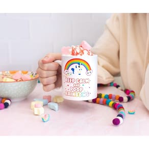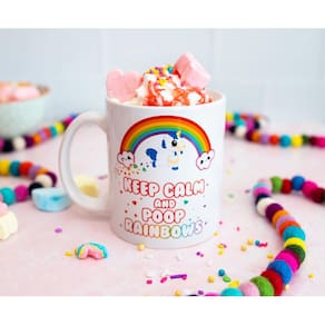 - DE BAIXO PARA CIMA: celebre o Glitter Galaxy com esta caneca oficialmente licenciada com um unicórnio mágico e um arco-íris colorido. A caneca diz “Mantenha a calma e faça cocô nos arco-íris”.