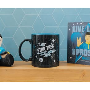 - ALTAMENTE ILÓGICO: esta caneca preta com detalhes em azul apresenta o oficial científico meio vulcano da USS Enterprise. O infinitamente fascinante Spock faz a saudação vulcana, ao lado da frase icônica “Viva por muito tempo e prospere”.