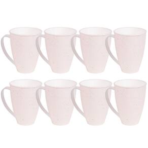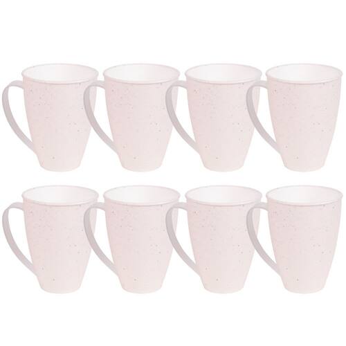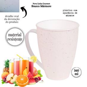 Conjunto com 8 unidades. Caneca de plástico alça para servir água, suco, refrigerante, chá, café, com decoração predominantemente branca com leves traços/ranhuras pretas por toda a peça, que traz uma aparência marmorizada super requintada ao produto.