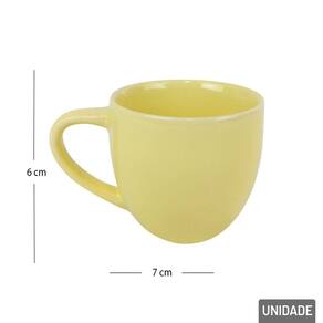Caneca de Porcelana 95ml Amarela Lisa - Canecas são perfeitas para tomar bebidas deliciosas no café da manhã, servir as visitas no café da tarde e tomar chás antes de dormir;\n- Além de ser composta por porcelana, contém um design liso que combinará com qualquer ambiente;\n- Capacidade para 95 ml;\nEspecificações:\nMarca : RR PORC\nTipo de material : Porcelana\nCores ou Estampa : Amarelo\nDimensões do Produto : 6 X 7 X 6 CM\nDimensões da Embalagem : 6 X 6 X 7 CM\nPeso Bruto (Gramas) : 0.135 Marca: Não Informado