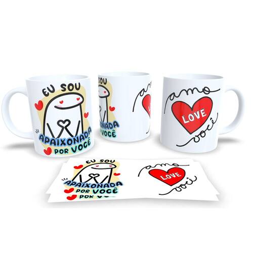 Caneca personalizada de porcelana de alto brilho, com interior e Alça Branca Coleção Flork Namorados.