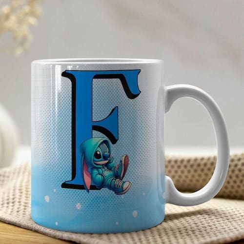 Caneca de Porcelana Personalizada Stitch Letras A-Z 325ml Azul F -