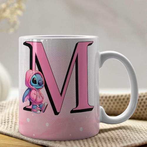 Caneca de Porcelana Personalizada Stitch Letras A-Z 325ml Rosa M -