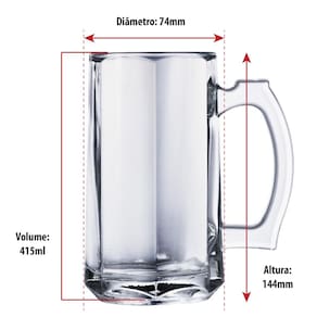 Indicado para: Cerveja e Chopp. Material: Vidro. Capacidade: 415ml. Medidas: diâmetro 74mm x altura 144mm.