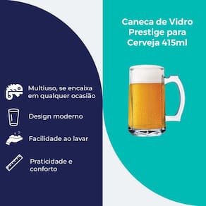 A Caneca Prestige é uma Caneca de Vidro com capacidade de 415ml, ideal para servir chopp e outras bebidas geladas. Seu design elegante e funcional proporciona uma experiência de degustação aprimorada, mantendo a bebida na temperatura ideal por mais tempo.