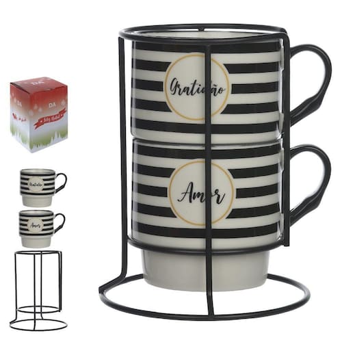 Caneca Dupla com Suporte 300ml Amor e Gratidão Preto/Branco As canecas de cerâmica com suporte é perfeita para presentear alguém especial ou seu amor. Uma peça linda e delicada que fará toda a diferença na sua casa. Características do Produto:Composição e Dimensões: 2 canecas capacidade de 300ml suporte de ferro 15,5x12cmMaterial: Canecas Cerâmica suporte de ferroMarca: D&AInformações Adicionais: Lavar com detergente neutro e esponja macia.Cor: Branco e pretoTipo e dimensões da embalagem: Caixa parda: 27x16x16 0,900kg Acompanha o produto:2 canecas 1 suporte