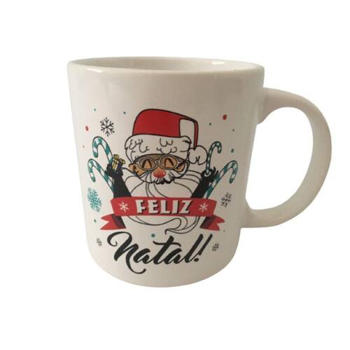 Contém 1 Caneca em Cerâmica Branca com detalhes coloridos Feliz Natal, com capacidade para até 340ml