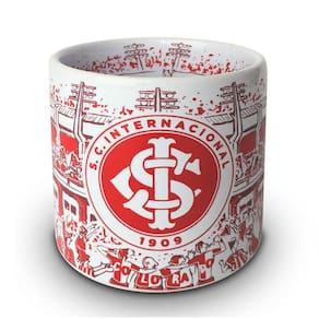 Esta caneca estádio simula o estádio do internacional em dia de jogo Na parte externa, a fachada, e na parte interna, a torcida. No campo de futebol, o momento exato em que o inter marca um golaço do adversário.