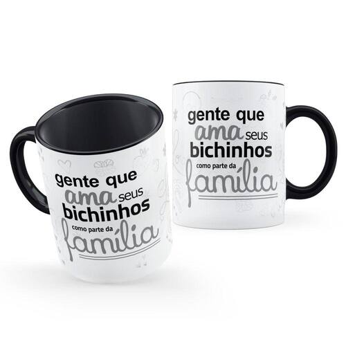 Com um design elegante, a caneca é branca por fora, enquanto o interior e as alças são na cor preta, criando um contraste moderno e sofisticado. Mas é na estampa que toda a magia acontece. Com a frase marcante "Gente que ama seus bichinhos como parte da família", essa caneca é um verdadeiro manifesto de amor e dedicação aos animais.