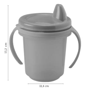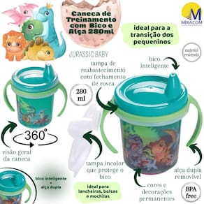 Caneca de Treinamento Decorada Dinossauros Baby com alça dupla, tampa de rosca e bico anatômico. Conta também com uma segunda tampa de sobreposição, que consiste em uma lâmina redonda de plástico incolor que se encaixa à tampa de rosca com objetivo de proteger o bico da caneca. A alça dupla, que é removível, fica fixada por compressão entre o copo principal e a tampa de rosca, já que seu design se resume em uma peça anelar única com duas saliências curvadas nas extremidades, que funcionam como pegadores. A resistência garante firmeza e transmite segurança aos bebês durante o período de transição da mamadeira para copos e canecas.