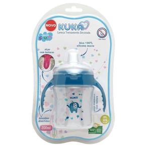 Caneca Kuka Treinamento Azul 200Ml 6+ Bico 100% Silicone Caneca Treinamento Decorada desenvolvida para auxiliar a criança que está começando a se alimentar sozinha, ideal para fase de transição. Alças com texturas que combinam com o desenho divertido sobreposto estimulando a imaginação da criança. O bico 100 % silicone macio com toque suave, é antivazamento e proporciona a saída de líquidos através da sucção da criança. Com capuz protetor. Modo de usar Antes do primeiro e após cada uso, separe os componentes (tampa, caneca e bico), lave com água, detergente neutro e enxágue bem. Cor: Azul Recomendações Antes de cada uso lave com água, detergente e enxágue bem. Caso a caneca fique virada com o bico para baixo, algumas gotas poderão sair pelos orifícios. Não permita que a criança corra com a caneca, evitando acidentes. Verifique regularmente o estado da caneca e tampa. Caso haja sinal de desgaste, descarte-a imediatamente. Não utilizar a caneca sem supervisão constante de um adulto. Nunca utilize a caneca com líquidos carbonados (refrigerantes e outros) ou sucos que contenham polpa. Este caneca pode ser usada para aquecimento de líquidos no forno micro-ondas, sem a tampa e pode ser lavado em lava-louças. Substituir a caneca após 1 a 2 meses de uso por motivos de higiene e segurança. Não utilize materiais abrasivos ou solventes de limpeza, pois os mesmos podem riscar a caneca e dissolver os desenhos. Utilize somente detergente neutro para lavar a caneca; Não permita que a criança mastigue ou morda o material macio do bico de silicone, evitando assim que a criança se engasgue e danifique o bico; Não limpar o bico com objetos pontiagudos e cortantes pois poderá danificar o produto. Lave em água morna usando sabão neutro e enxágue bem; A caneca poderá absorver os pigmentos de alguns alimentos devido a característica do material. Isto não compromete a utilização do produto. Após cada uso, a caneca deve ser lavada conforme instruções na embalagem. Bico de silicone macio antivazamento. Capuz protetor.