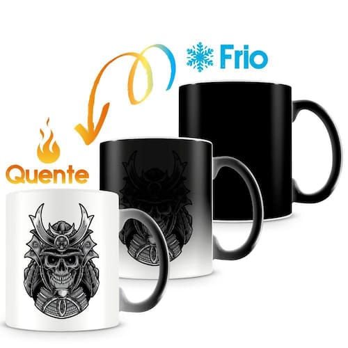Seu design apresenta uma estampa fascinante de um samurai, mas o verdadeiro encanto é revelado quando a caneca é preenchida com líquidos quentes, revelando detalhes adicionais e criando uma experiência visual única.