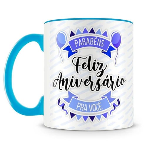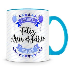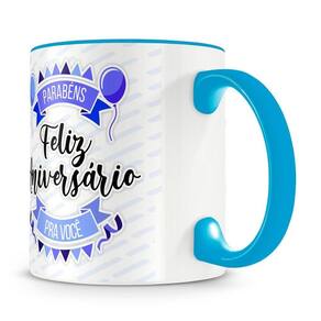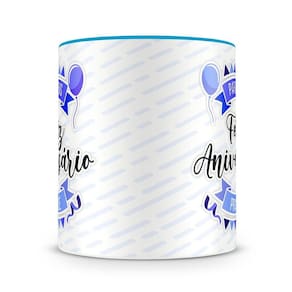 Caneca personalizada de porcelana de alto brilho, interior e alça azul claro, com estampa para aniversariante.