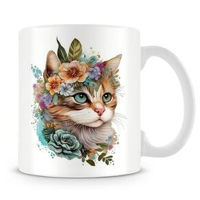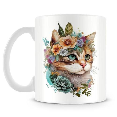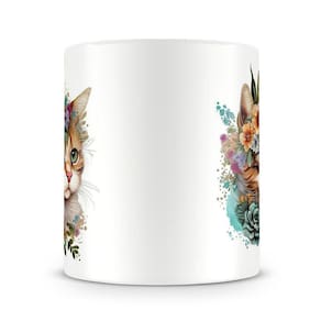 Caneca personalizada de porcelana de alto brilho com linda estampa de gatinho florido.