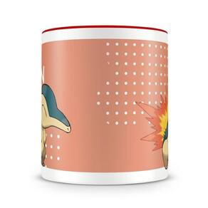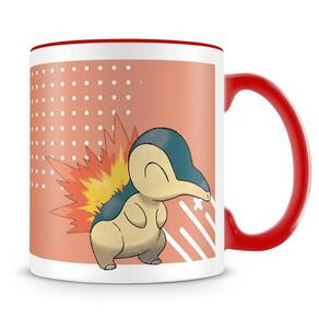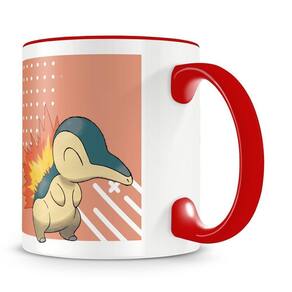 Caneca personalizada de porcelana de alto brilho interior e alça vermelha com linda estampa do pokémon Cyndaquil.