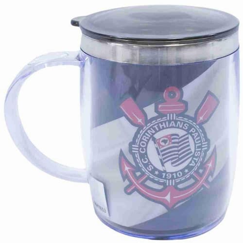 Elegante caneca térmica com revestimento externo de plástico e interior de inox para manter a bebida bem gelada. Vem com tampa e estampa interna nas cores e brasão do Corinthians.