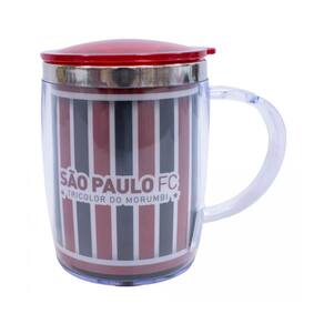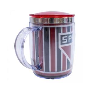 caneca térmica com corpo arredondado para 450 ml estampa com as cores e brasão do são paulo. Acompanha tampa. Interior de inox e revestimento e alça de plástico