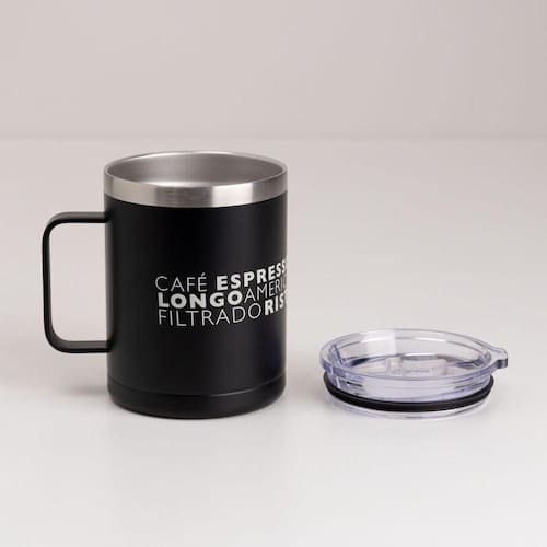 Toda em aço inoxidável e contando com 1 tampa com bocal, ela traz o nome de diversos tipos de cafés impressos na cor off-white e tem capacidade para 400 ml do seu café fresquinho. Sendo a caneca para escritório perfeita para levar pro trabalho e também uma ótima opção de presente, já que mantém a bebida fria por até 12 horas e quente por até 3 horas!