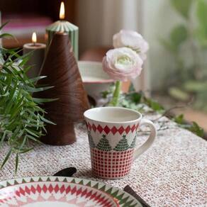 Descrição Uma coleção onde a magia do circo encontra o encanto do Natal. A vibrante atmosfera circense ganha vida em cada peça, trazendo cores contrastantes inspiradas nos tons clássicos da época, verde e vermelho. A alegria e a extravagância do circo se unem ao espírito festivo da temporada, criando uma mistura única e encantadora. Elementos marcantes como o pinheirinho e as bengalas de alcaçuz ganham destaque, trazendo um toque lúdico e cheio de charme à sua mesa. A caneca Tulipa tem capacidade para 330 ml.