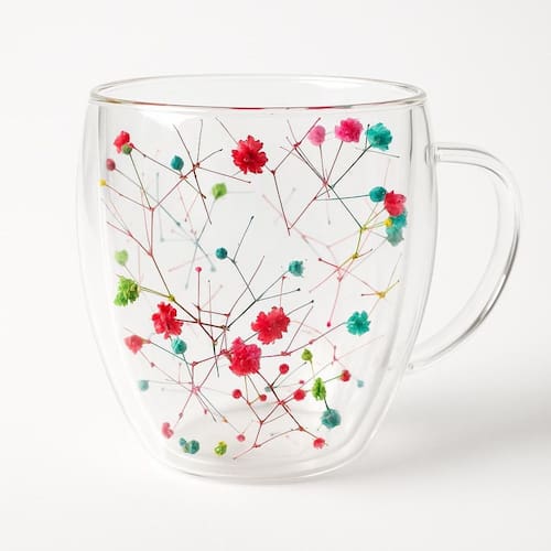 Caneca de vidro dupla parede com pétalas de flores - beleza e funcionalidade para sua bebida A caneca de vidro dupla parede com pétalas de flores é uma peça que une elegância e praticidade, transformando o momento de saborear sua bebida favorita em uma experiência visual encantadora. Com capacidade para 350ml, esta caneca é ideal para chás, cafés, cappuccinos e outras bebidas quentes ou frias.