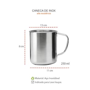 Canecas em aço inoxidavel. As canecas sao perfeitas perfeitas para uso em restaurante, buffets, bares e lanchonetes ou para acampar. Pode ser usada na lava louças e tem muito mais durabilidade e versatilidade.