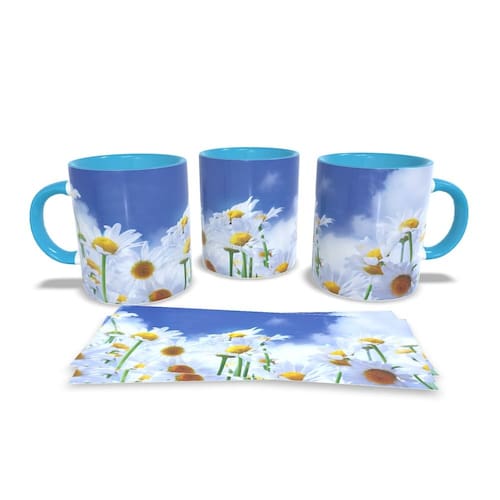 Caneca personalizada de porcelana de alto brilho, com interior e alça Azul com linda Estampa da Coleção Flores.