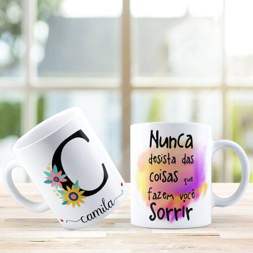 Caneca personalizada de porcelana de alto brilho, com interior e alça branca com linda Estampa Alfabeto Floral Frases.