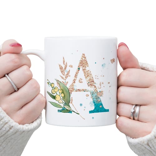 Caneca personalizada de porcelana de alto brilho, com interior e alça branca com linda Estampa Alfabeto Floral Glitter.