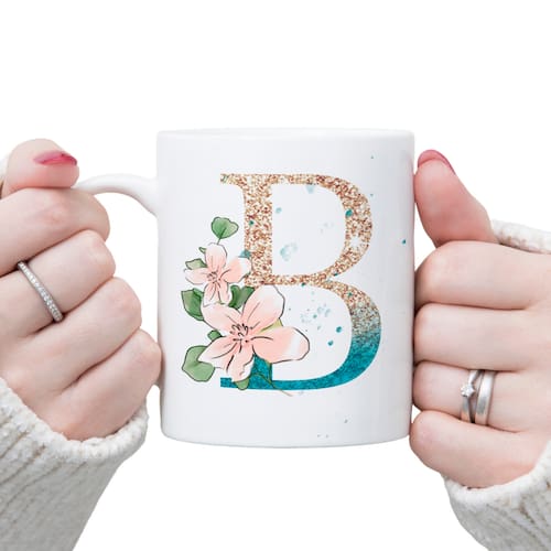 Caneca personalizada de porcelana de alto brilho, com interior e alça branca com linda Estampa Alfabeto Floral Glitter.