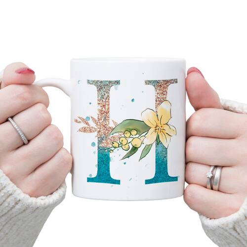 Caneca personalizada de porcelana de alto brilho, com interior e alça branca com linda Estampa Alfabeto Floral Glitter.